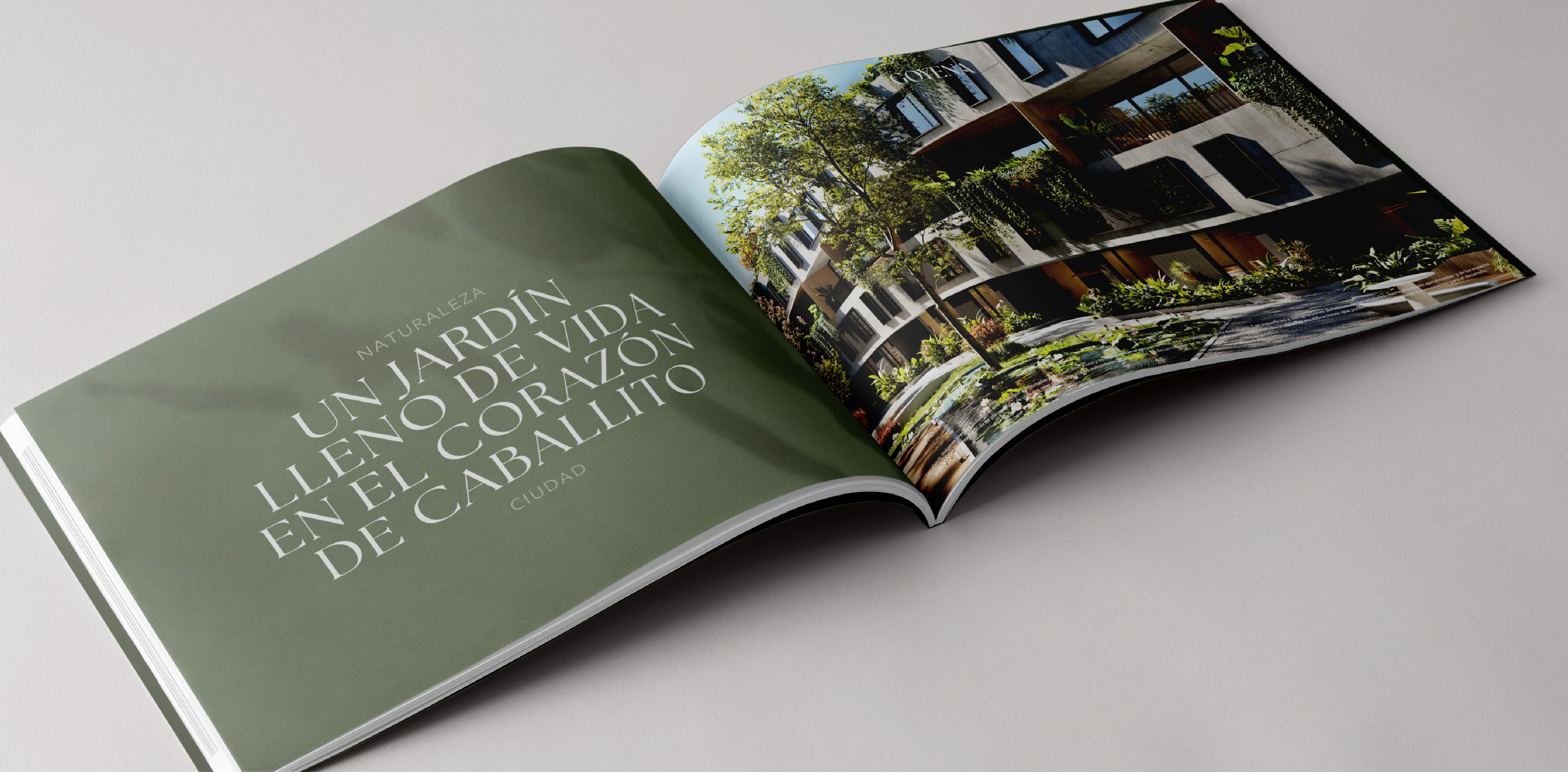 Una paleta de verdes profundos con acentos terrosos refuerza el vínculo con el jardín central y los amenities al aire libre, manteniendo coherencia en todos los soportes. El resultado es una identidad acogedora que comunica la experiencia de vivir en un entorno urbano donde la naturaleza, la gastronomía y la vida social confluyen.